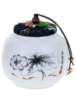 Belle boite à thé en porcelaine d'une contenance d'environ 50 g ou 230 ml avec couvercle en tissu et liège en emballage cadeau dans une boite.